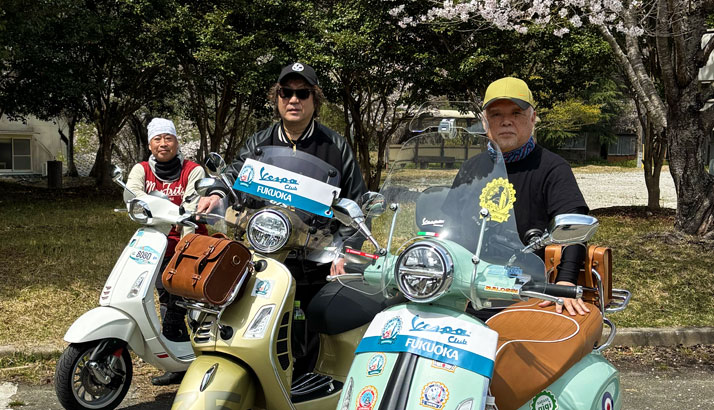 北九州から参加された新メンバーのロンディさん(入会早々のご参加でした)、今回より準会員となられたcolinさん(県外よりご参加で、早朝に福岡へ到着されました)、shinchanとの3名でのツーリングとなりました。気持ちの良い風に吹かれながら桜を愛で、ベスパを愛するメンバー同士でベスパクラブ福岡の成り立ちや想いなどを語り合いました。ベスパクラブの活動や国内外との交流を「今まで以上に密にしていこう!」と感じた今回のツーリング。……胸が熱くなりますね。